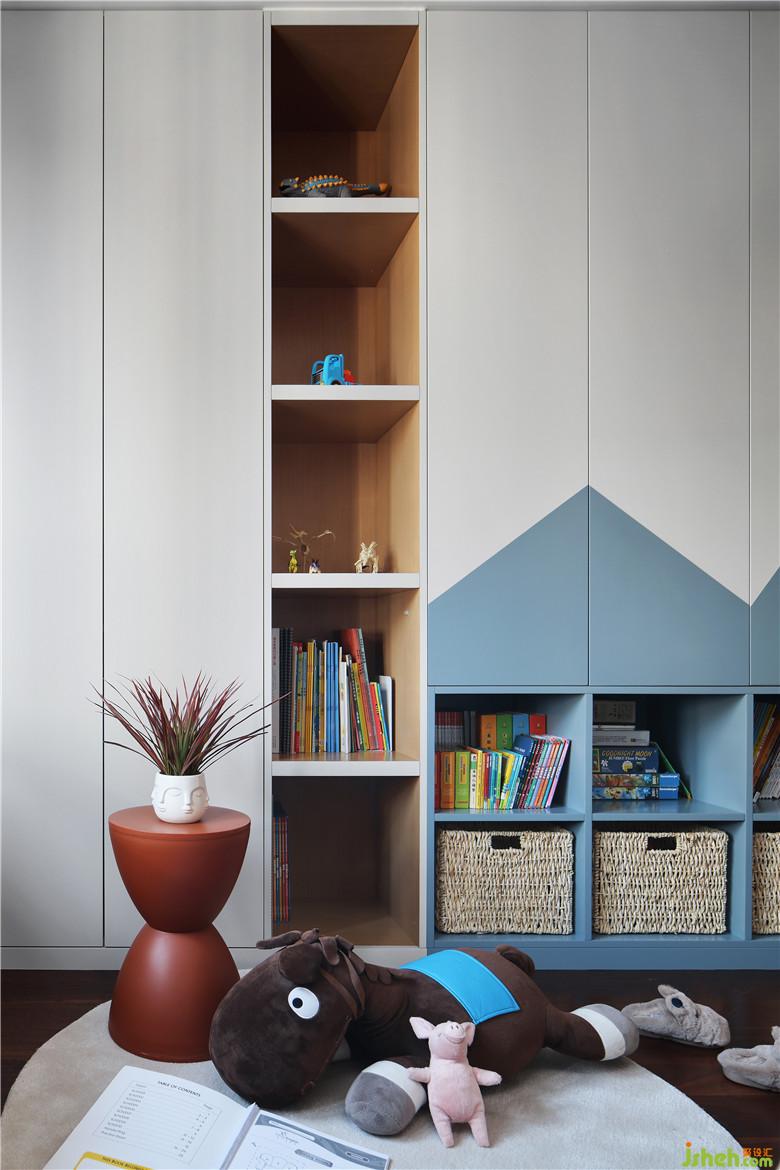 北次卧做了一整排组合柜,增加了储物的功能,小朋友的玩具、书本再也不用担心乱堆。里面配套的收纳竹篮也都是我们精心挑选,在柜子设计初便将尺寸核对好的。