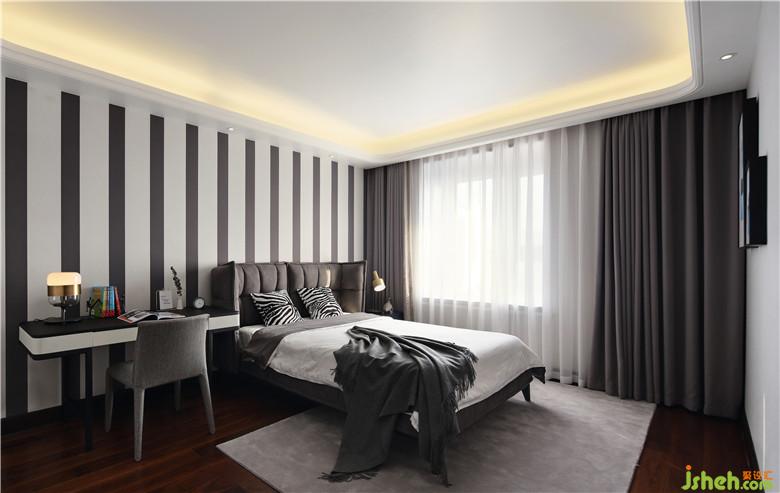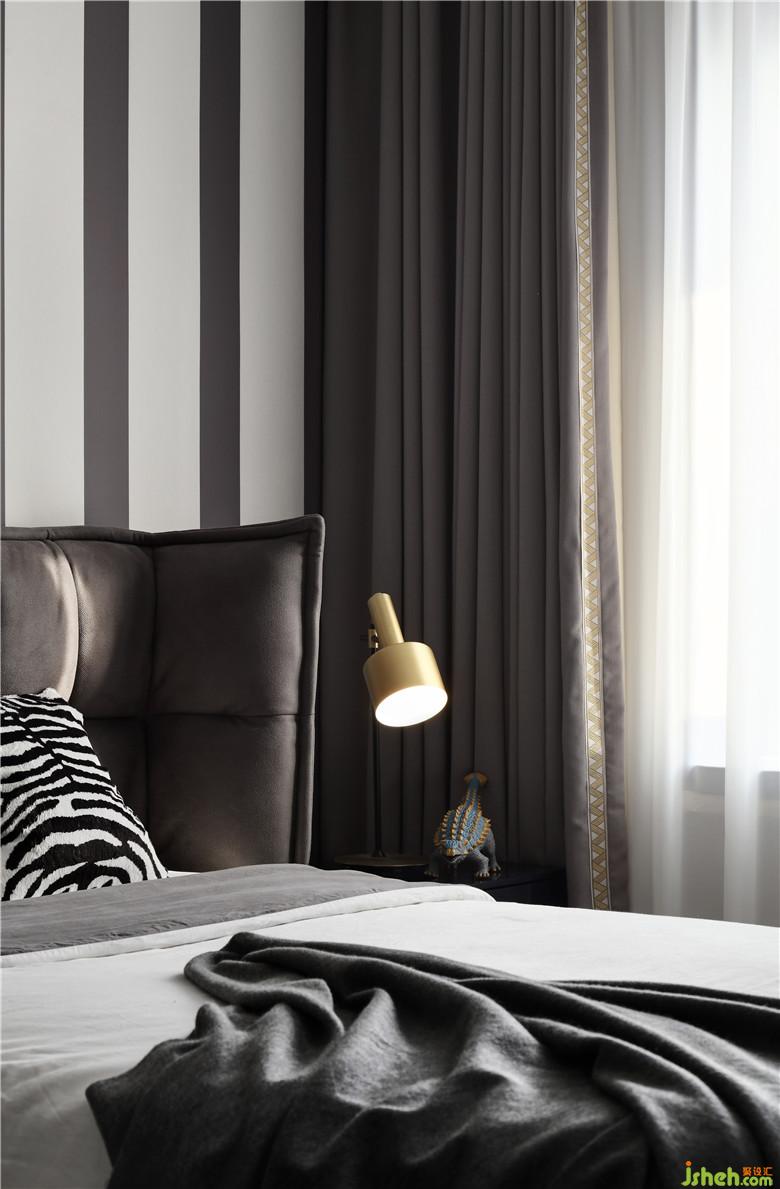 南次卧打造时尚前卫的空间氛围。拆除了之前交付时的棕色背景墙,换做竖条纹的大块背景,搭配深灰色面包床,整个空间的感觉立刻焕然一新。