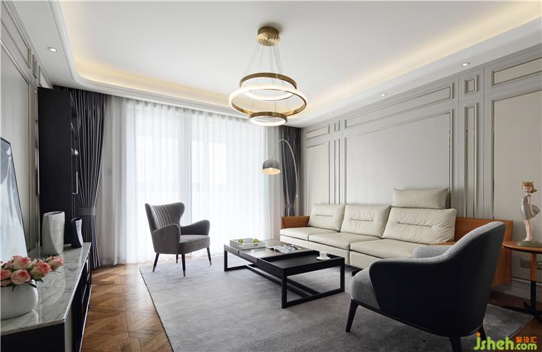 客厅使用深浅不一的灰色调与精装房原有的地板形成反差,突出重点,打造出轻松愉悦的氛围。