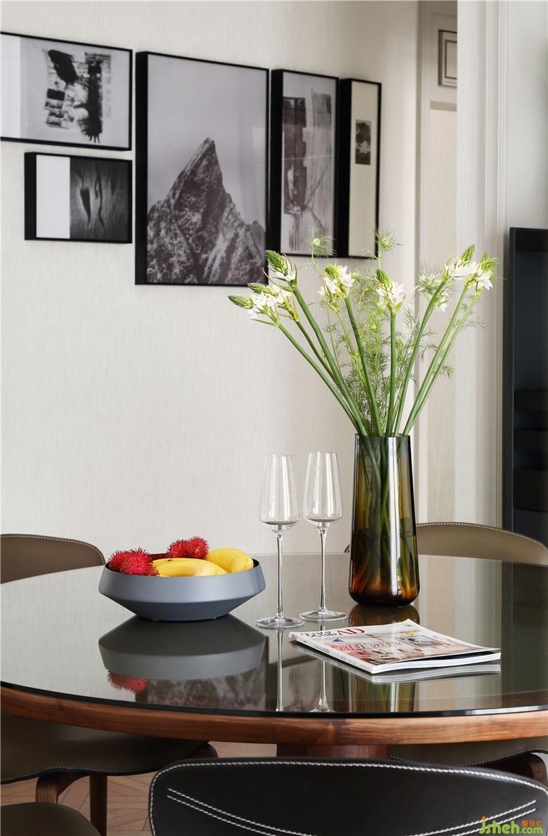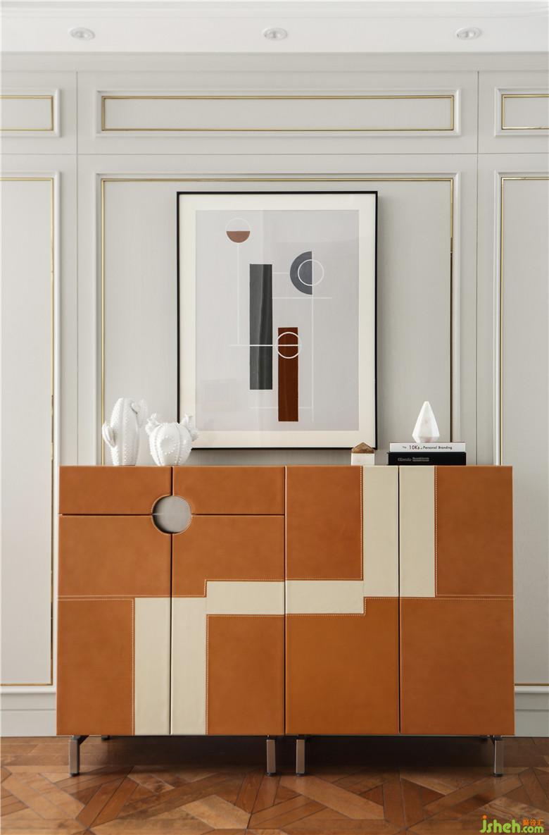 入门处的原皮端景柜兼具鞋柜的功能,柜门几何形状跳色的处理与装饰画的内容形成呼应、色彩成为对比,浪漫和理性在这里形成了完美的碰撞 。