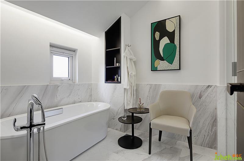 艺术与生活需相互作用,主人的卫生间融入了独立浴缸,白色的空间以抽象的挂画点缀其间,微微透光,画面舒适,唯美…