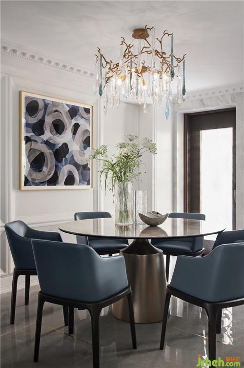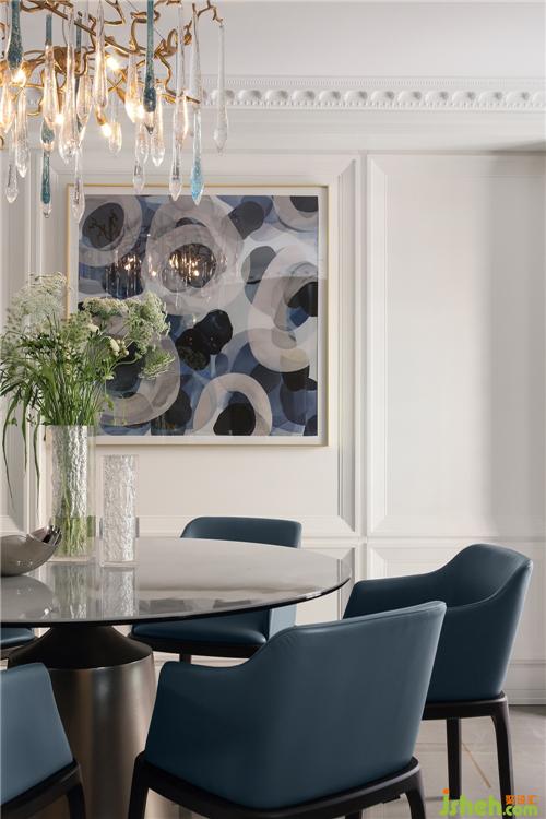 墙面抽象的艺术品定制与西班牙水晶灯形成碰撞,以优雅神秘的蓝色为主色调,与客厅遥相呼应 融为一体。