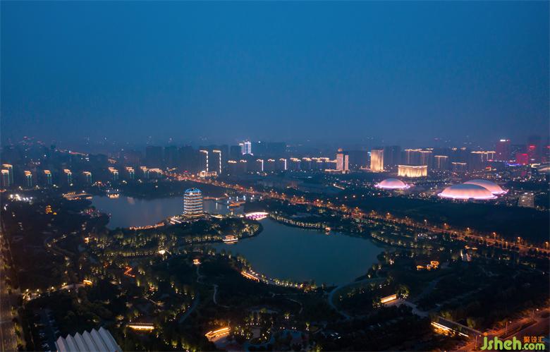 暮色降临时于稀薄暗影中灯光透过植物隐出斑驳光痕