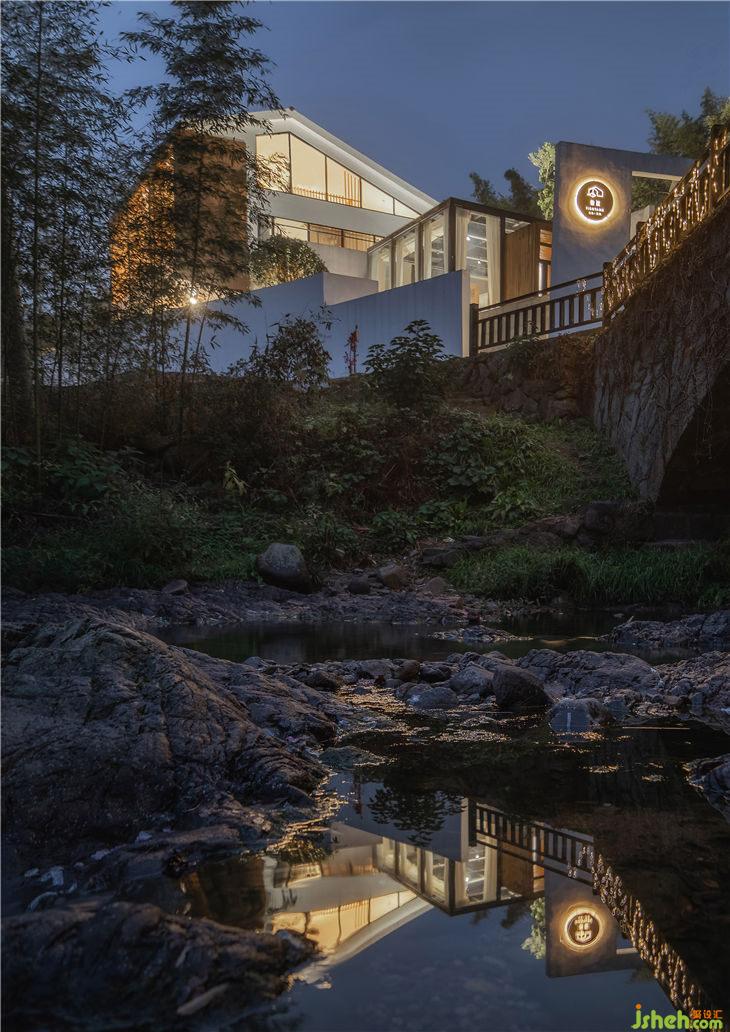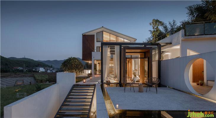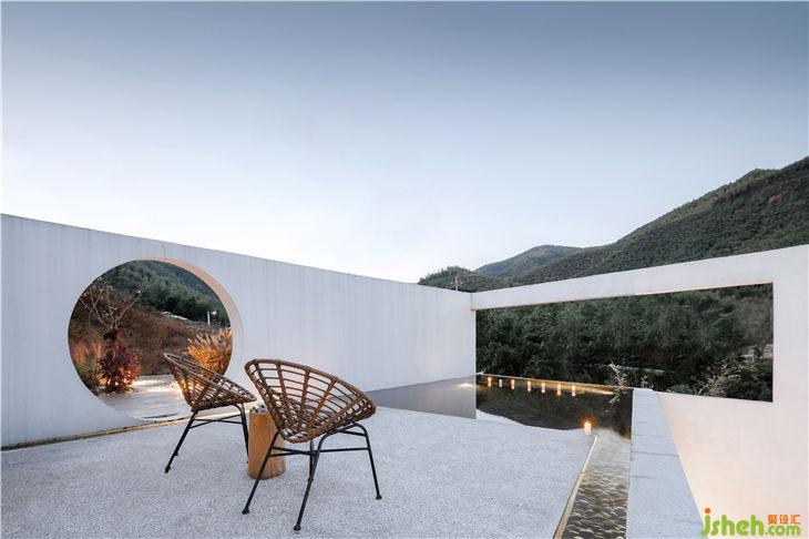 鱼缸的建筑设计以极简为主,剔除多余的装饰,建筑线条流畅,任何一个角度看过去都极具几何空间之美。设计师在观景平台上运用了“天圆地方”的概念,坐在椅子上,透过方形的墙体望去,满眼都是一片碧绿的竹林,前方的水池将竹林景色倒映其中,融合成一副美丽的山水画,与自然仿佛进行了一场有趣的对话。通过圆形的门可以看到远处的茶园,同时也能通往餐厅以及院子等空间,美观又不失功能性。