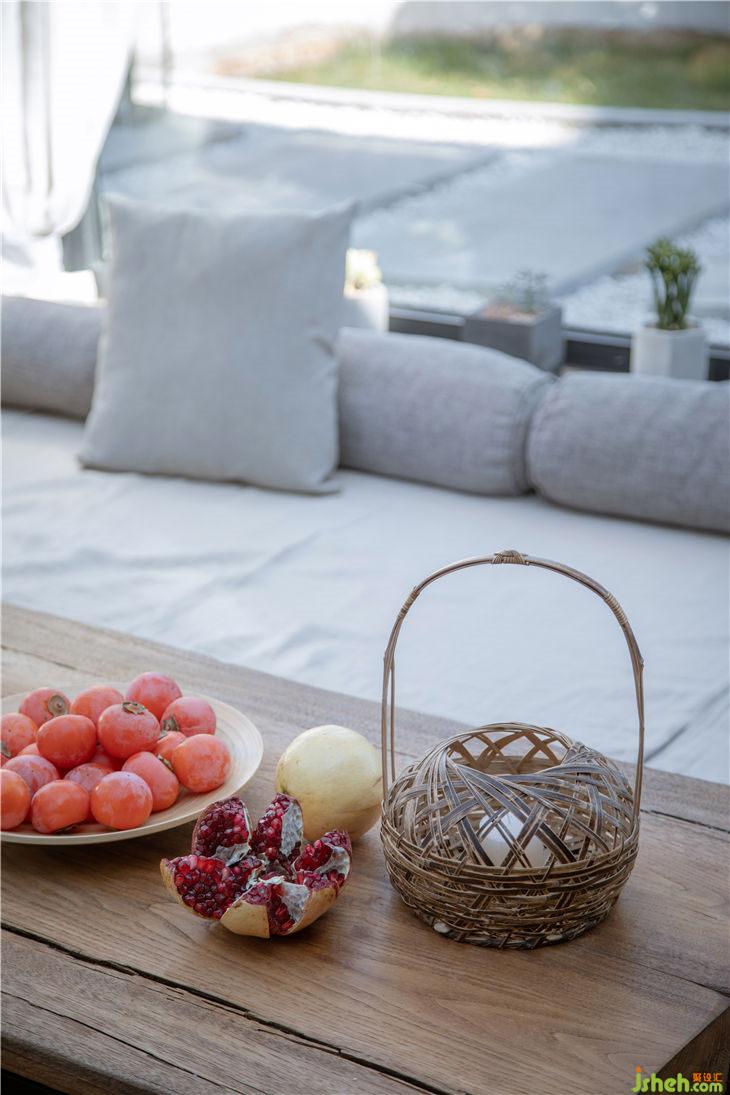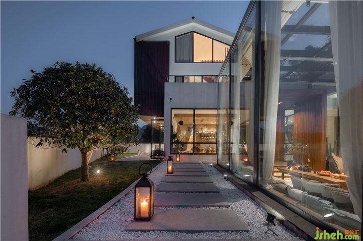 整体空间规划以小区域功能景观来划分,通过一步一景的设计,将小面积的空间变得有趣生动。户外的休闲空间铺满白色石头,将活动空间与居住空间分离,格栅的木头走廊富有节奏感,白天阳光照射过来,能够呈现出不同的光影。