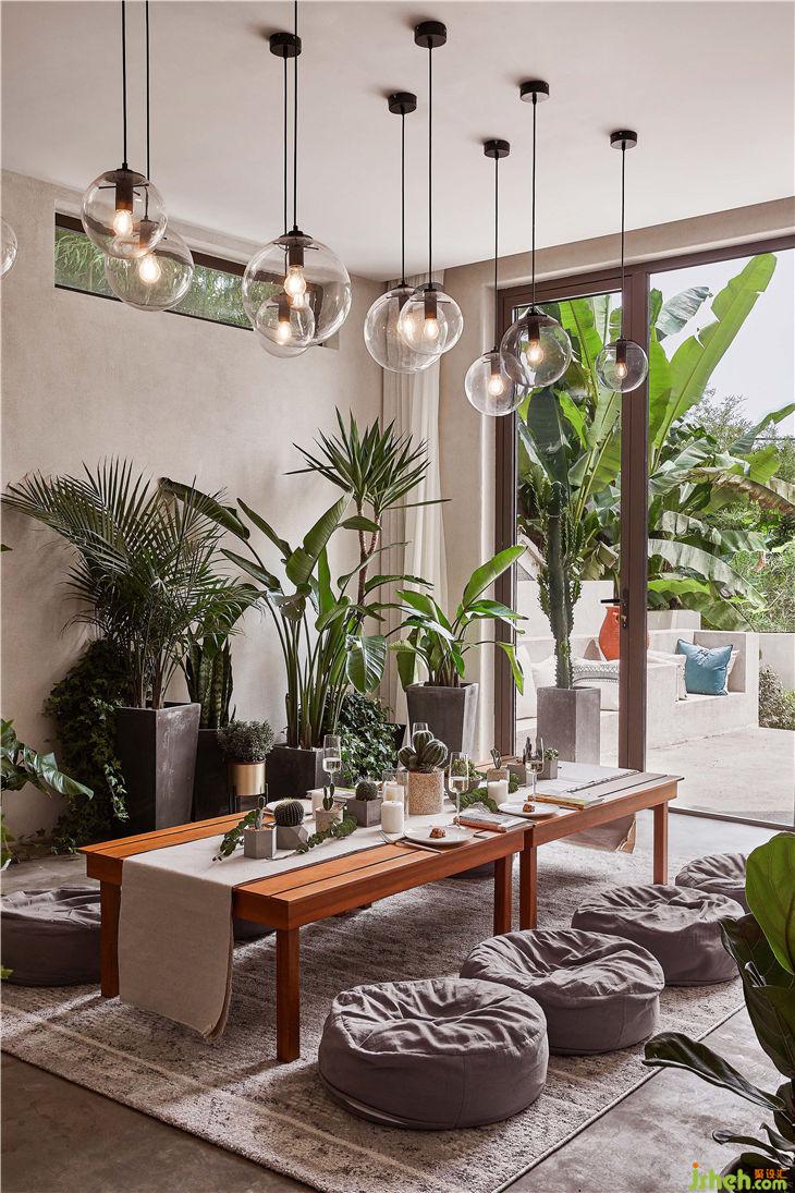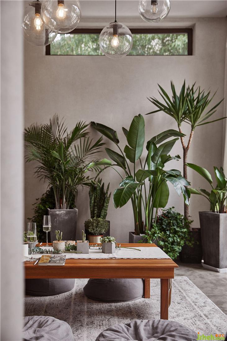 以自然喻情,往往作为设计的出发点,庭院的一角布置着一片枯山水以及休息区,以静制动,将空间利用到极致。另一边则种着原始的芭蕉叶,设计成台阶式的座椅,休憩于此,人与自然作伴,妙趣横生。