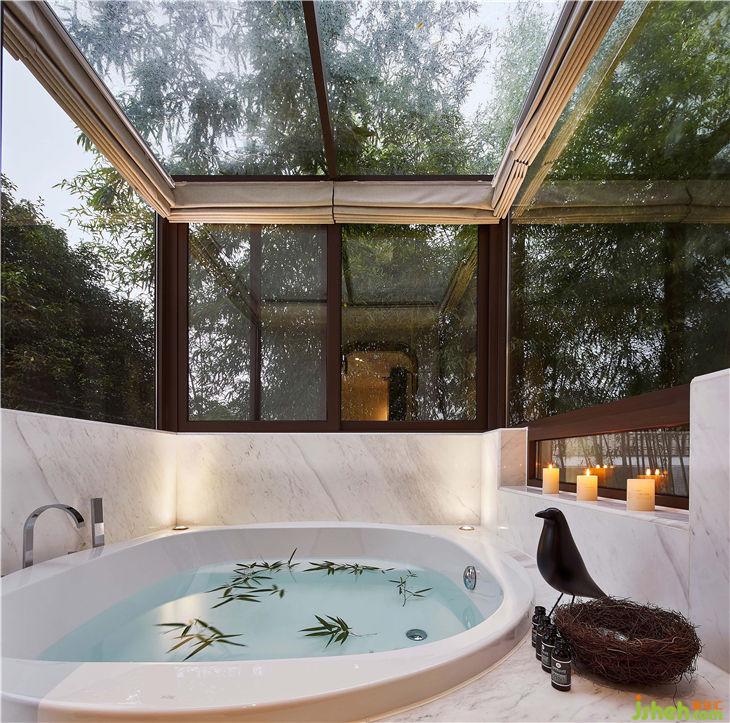 SPA区的设计也是别具一格,通透的大玻璃、将四周大片竹林风景引入室内、雅致的江南风情顿时发挥地淋漓尽致,自然环境与空间相结合,万物归一,无不体现着对生活本质的向往。