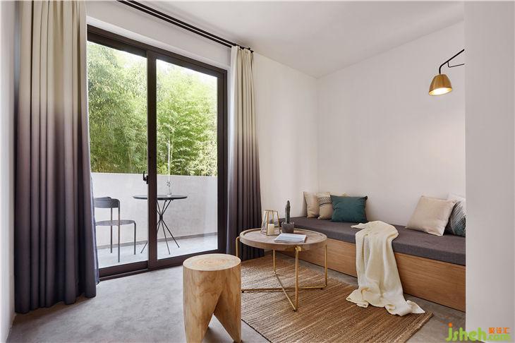 可以看到另一边放置着木桌与坐垫,周围植物环绕,仿佛置身于大森林中,没有过多的装饰,希望室内是安静简单的,更多地是享受户外的自然,营造塔莎奶奶式的被植物围绕的自在空间。