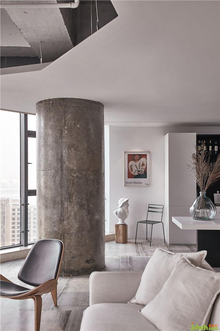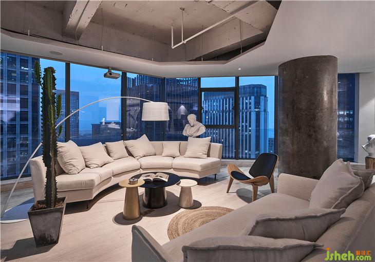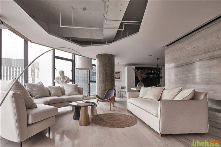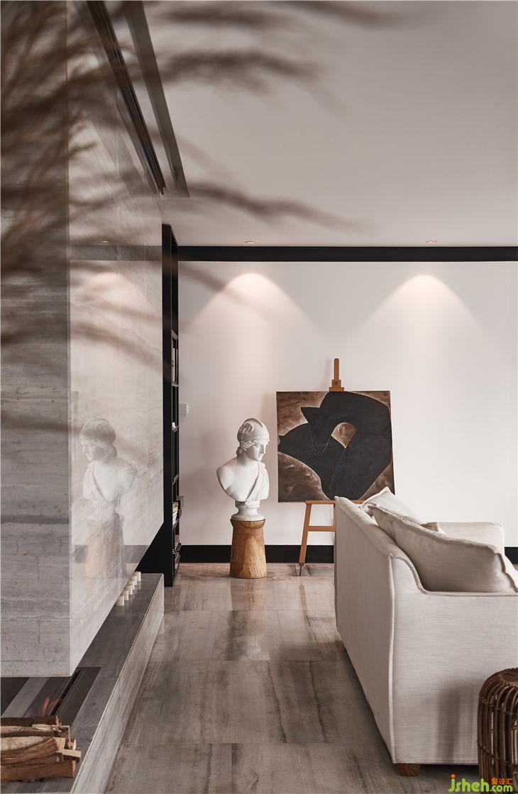 大厅中摆放着米色的麻质沙发、木质感的设计师椅子、金属质感的茶几,暖色的射灯让空间变得柔和且温暖,空间节奏感变得丰富起来,增添了一丝生活气息。