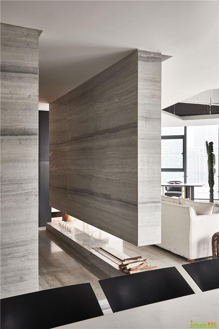 从水吧区到大厅间穿插了一个“隧道”,大理石材质的体块底端配以悬挂式壁炉,作为一个重要的通道连接着空间的各个区域。走在其中,虚实之间,形成丰富又连续的空间秩序。