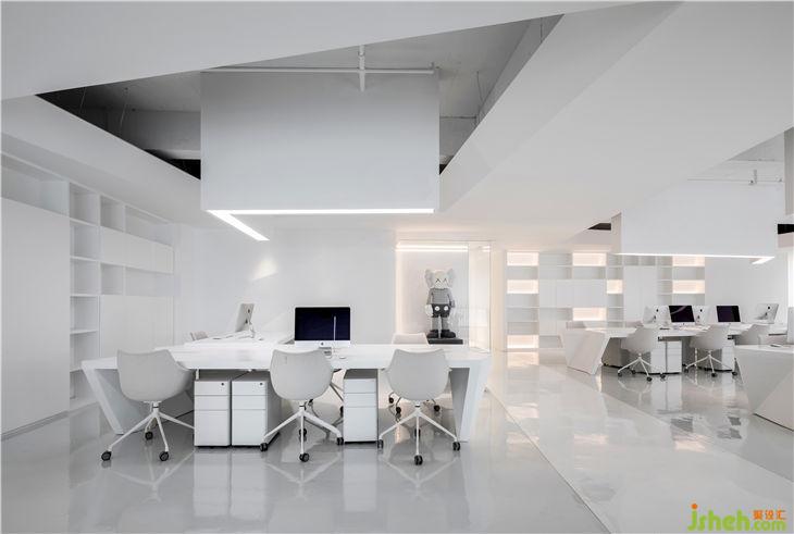 为了让办公空间变得富有趣味性,从褶皱感抽象出的几何形办公桌,以及大型艺术装置让整个空间充满了活力。绿色植物的点缀在白色的空间中格外醒目,天然的色系能够让人变得沉浸并且放松。