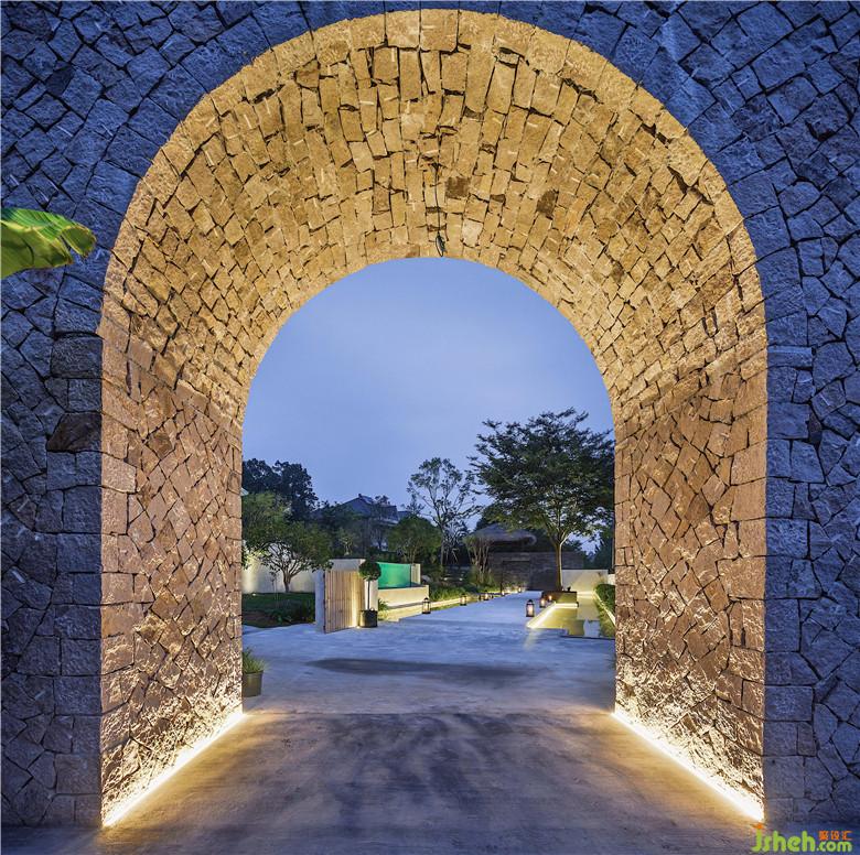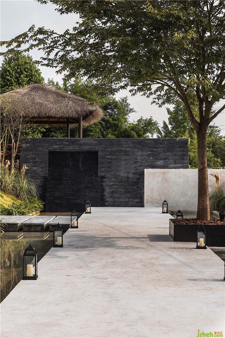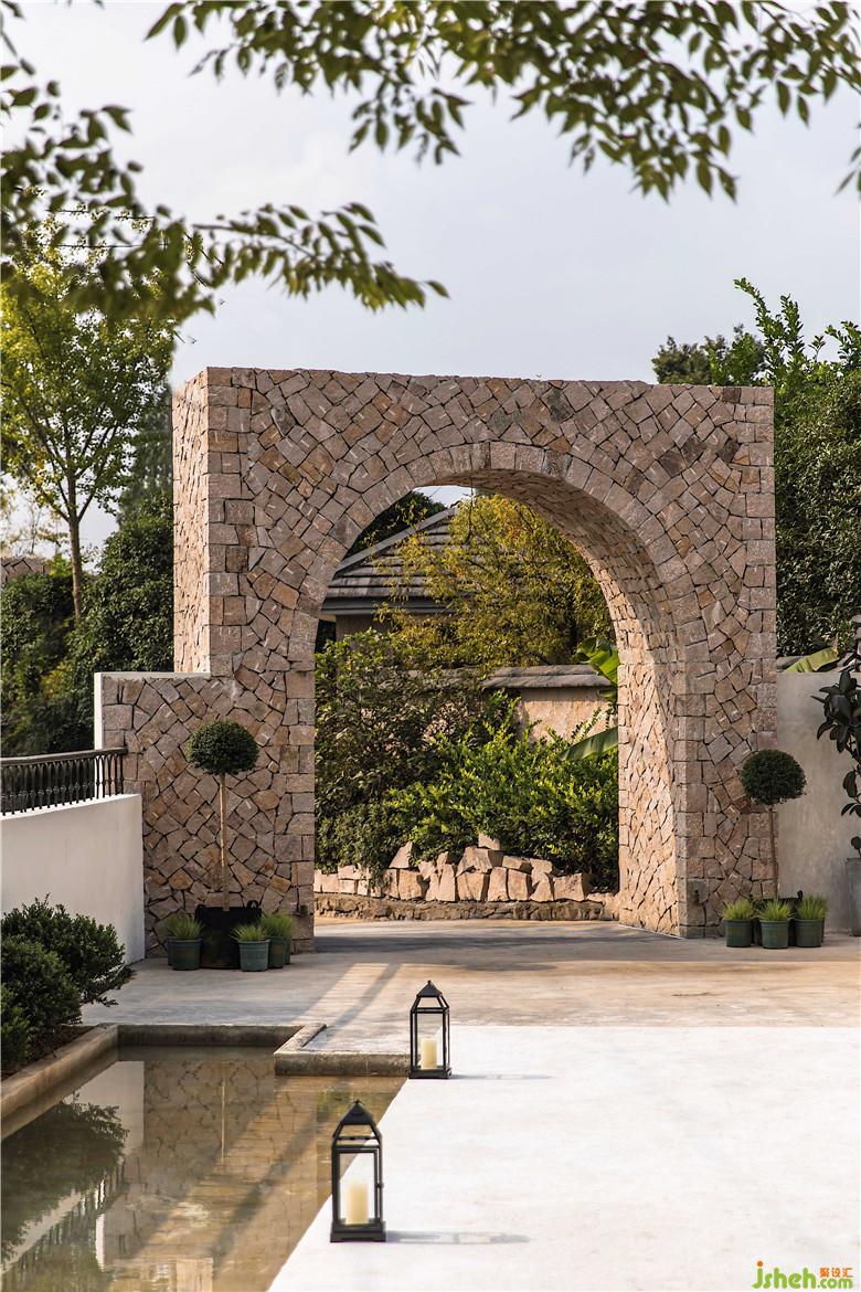 入口处的石砌拱门极具仪式感,一块块经过人工手工切割堆积而成。长长的白色汀步走道,仿佛是一条浮在水上的路,映照着城堡中护城河与桥的元素。伴随着水流声,蝉鸣声,风吹过树林的沙沙声,迎接着远道而来的客人,一切生命都仿佛在流动,散发出自然的力量。