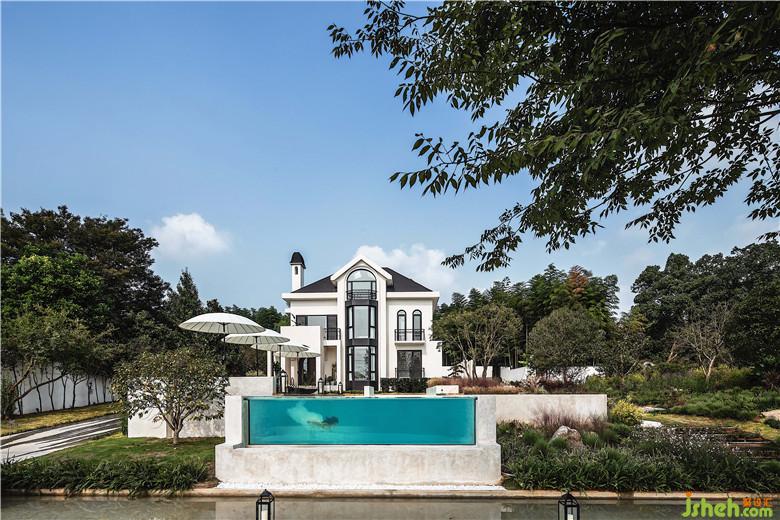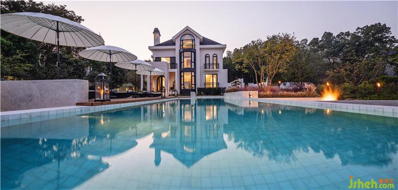 建筑的前方是一片淡蓝色的可循环泳池,端口做了全透明玻璃处理,像是泳池的发光体。清澈的水面倒映出建筑体,丰富了视觉感受。在泳池边开一场篝火派对,游泳,品尝美食,欢歌雀舞,远离城市的喧嚣,呼吸自由与清新的空气。
