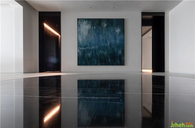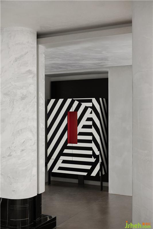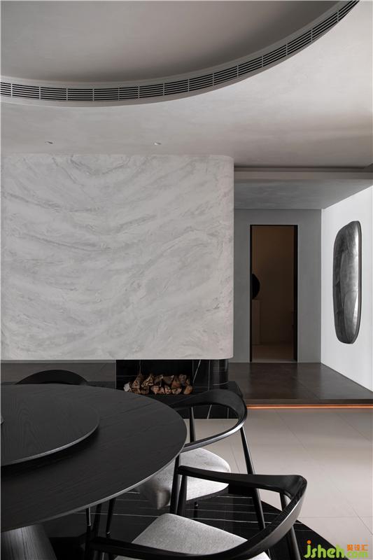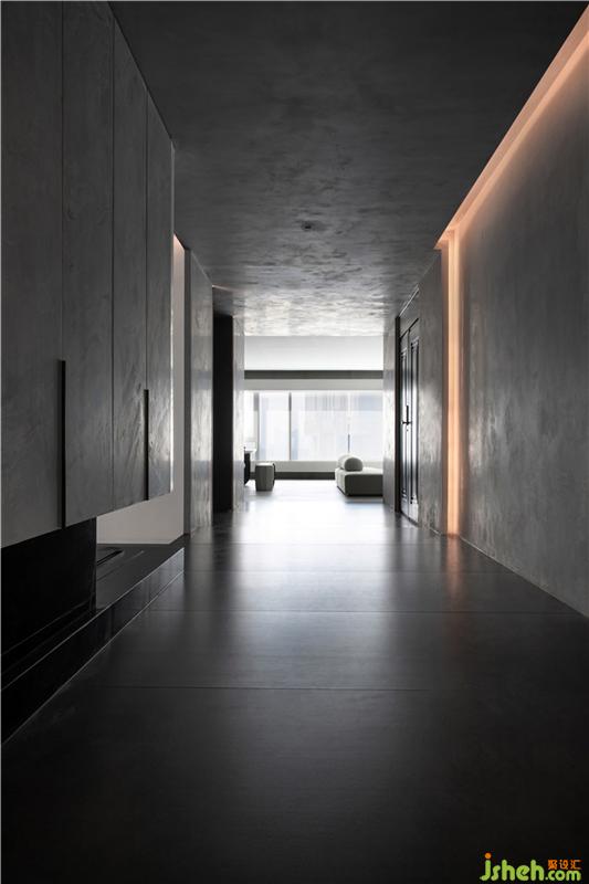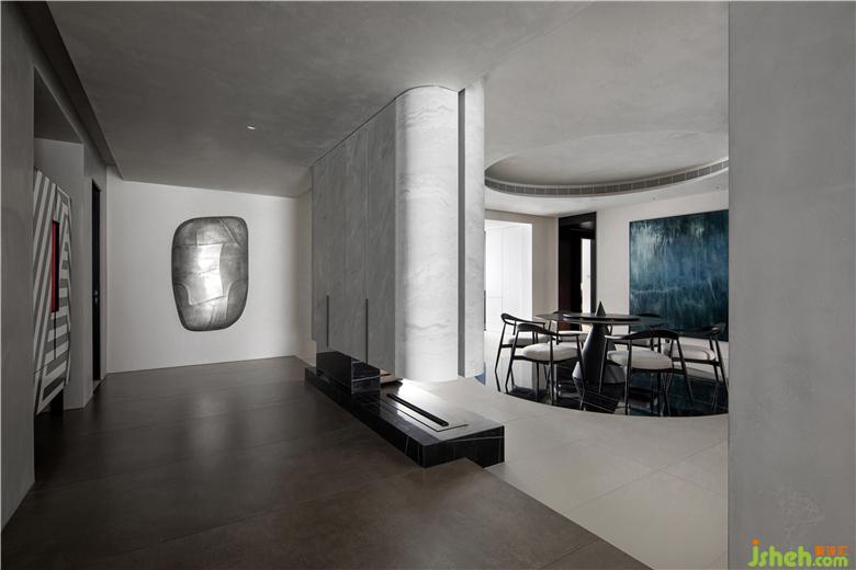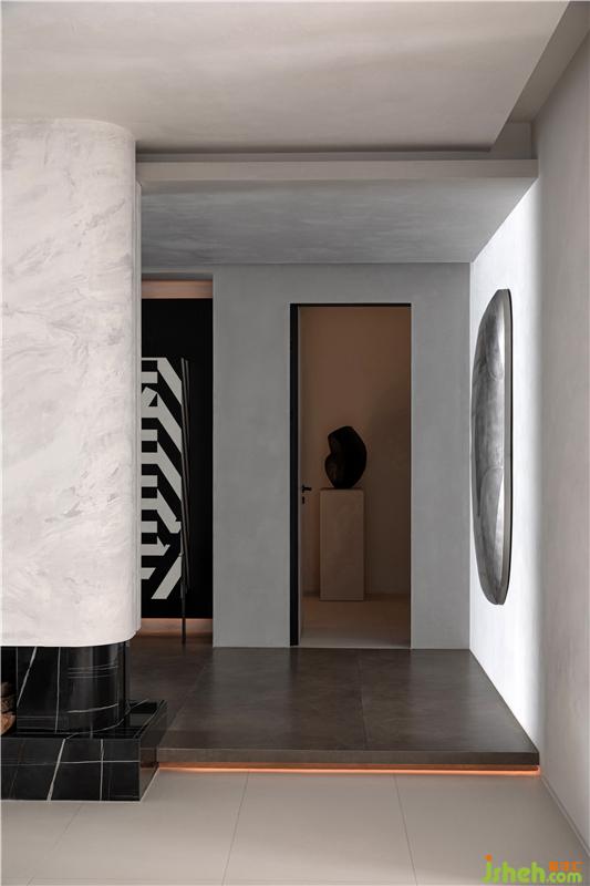 走廊作为空间的连接点,像是一座桥梁为整个空间添加创造力,其中放置了可以收纳日常用品的柜子,水滴的艺术装置,以及一面内凹的造型墙,以一种拥抱空间的姿态正对着入户门,让人感受到空间充满着原始的力量感。