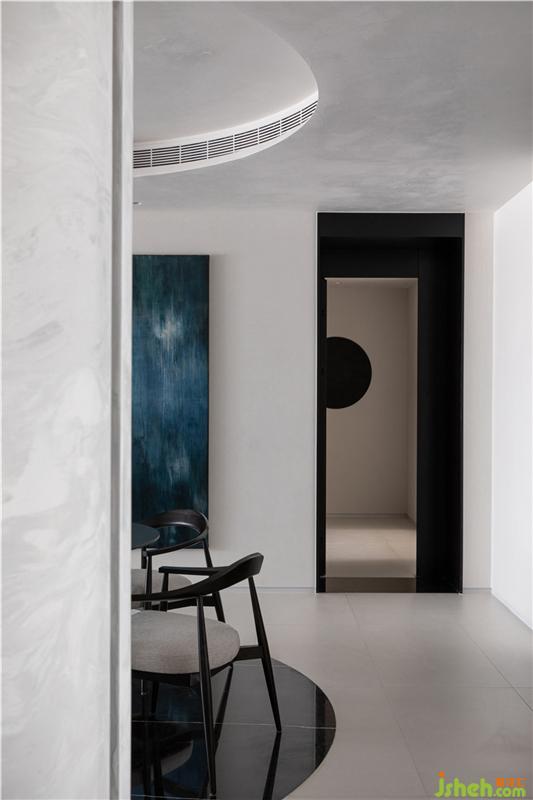 The corridor, as the connecting point of the space, is like a bridge to add creativity to the entire space. There are cabinets for storing daily necessities, art installations with water drops, and a concave shaped wall, facing the space in a gesture of embracing the space. With the entrance door, people feel that the space is full of original power.