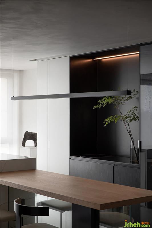在原有格局基础上,为了满足主人不同的用餐需求,设计师划分出一个西厨区域,灰色玻璃柜可以收藏酒品、餐具等。