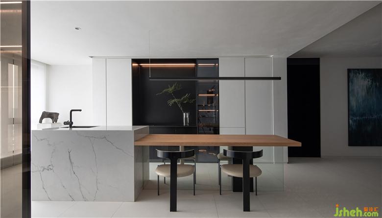 Based on the original layout, in order to meet the different dining needs of the owner, the designer has divided a western kitchen area, and the grey glass cabinet can store wine, tableware, etc.