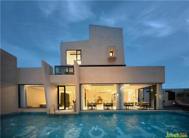 设计师让建筑拟化成海岸边的一块礁石,将斜切面的元素延用至空间的每一处细节中。打破建筑传统四方的概念,建筑在拥有功能性的基础上能够与自然相结合,显得独具一格。