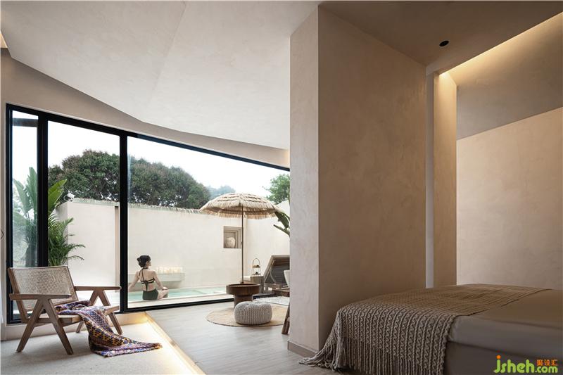 改造前的言海原本是一间村民的房屋,设计师重新进行了区域划分,在拥有着十二间客房的同时还有活动草坪、篝火派对区、餐厅、以及星空泳池。