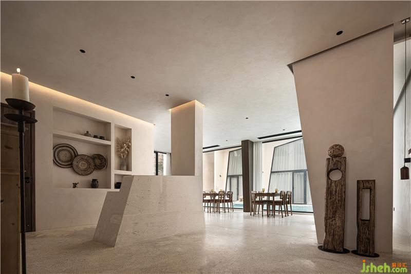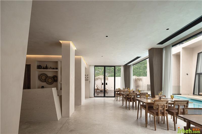 公共区域与餐厅进行结合,透过落地玻璃可以看到星空泳池的全景。