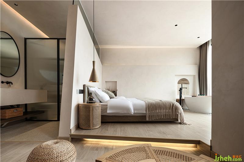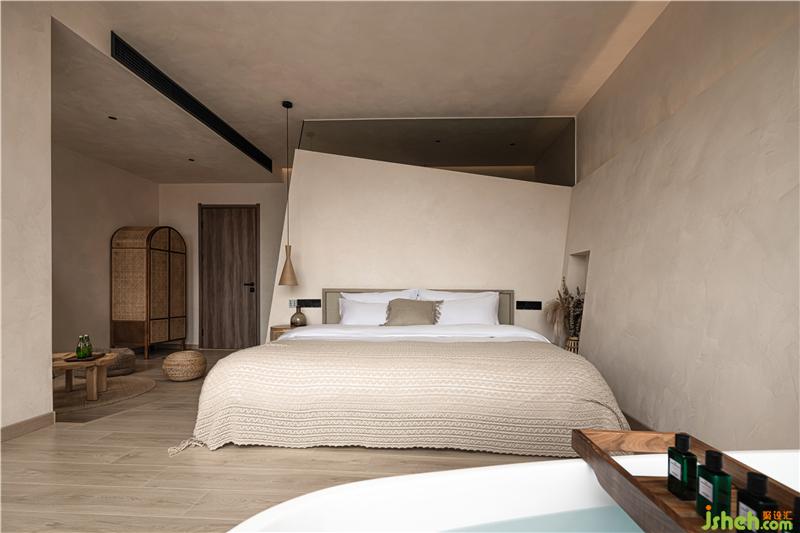 Walking up to the rooms on the third floor, you can see the sea view not far away. The background wall tilts into the space like the inspiration of abstract waves, which is full of movement.
