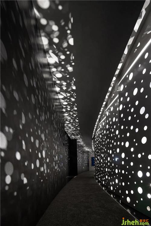 一条弧形走道贯穿着两边的客房,为了让建筑独立,采用一片开出圆孔的金属板与周围环境相隔,光从圆孔中穿出,斑点如波光粼粼的水面般映照在墙面上,穿梭在光影中,如梦似幻。
