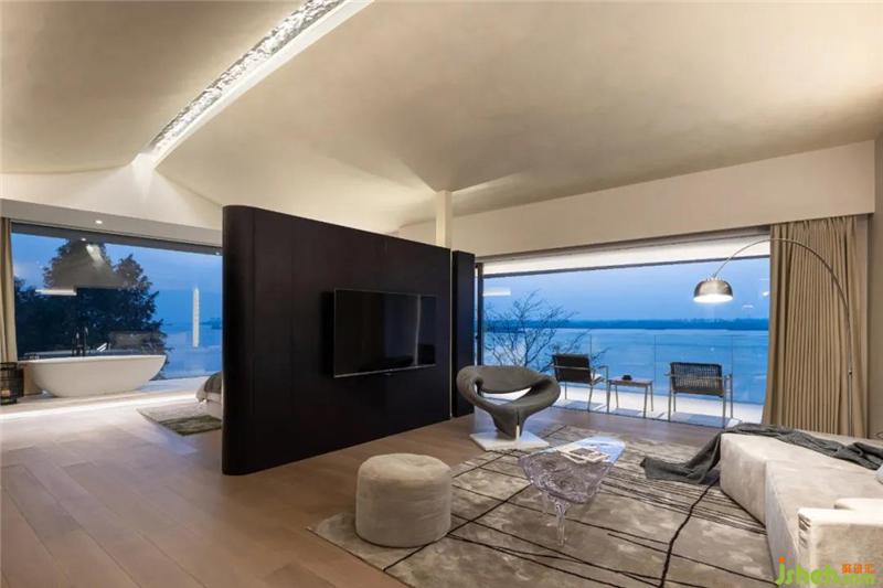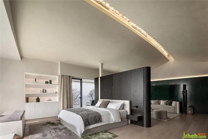 西边的套房有着客厅休息区,休闲书柜以及spa区,素雅的配色与家具充满着现代感与艺术感。