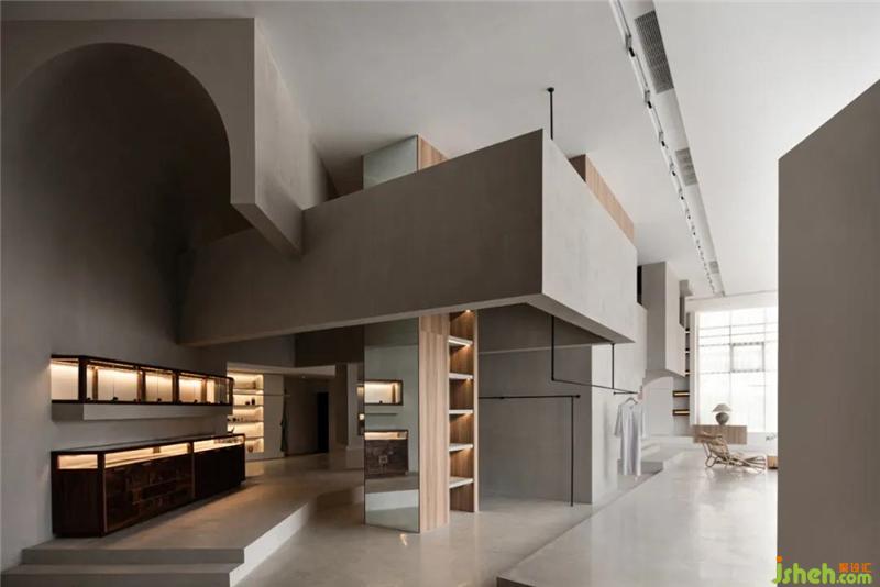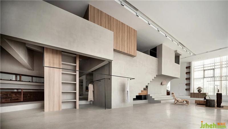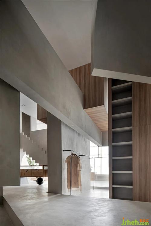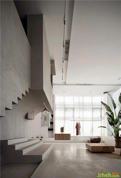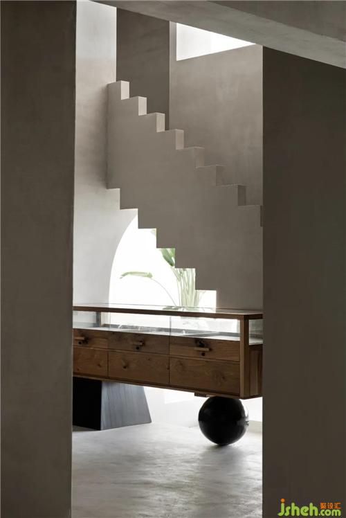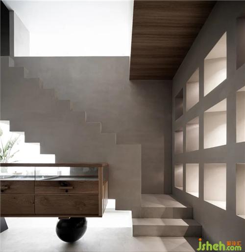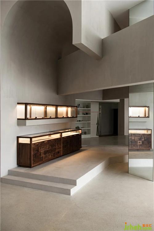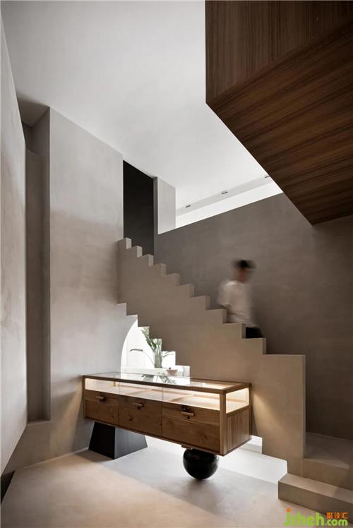 Inside the space, is a jewelry display area, specially customized modeling display cabinets and stairs are combined together, you can freely enjoy the display products. A jagged staircase mimics the edges of ramie leaves, leading up to a jewelry studio.
