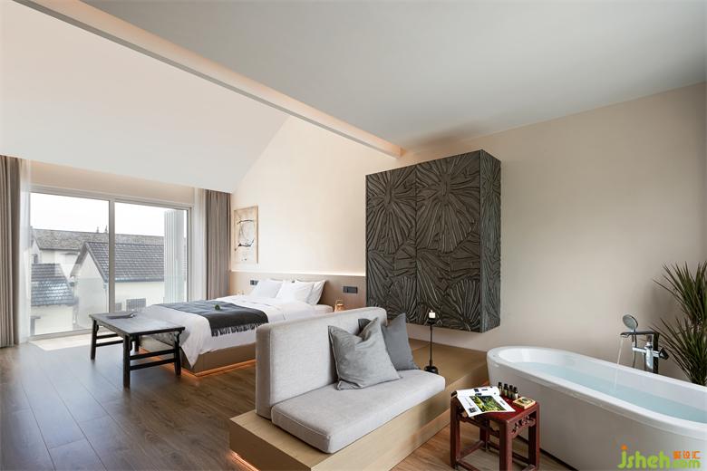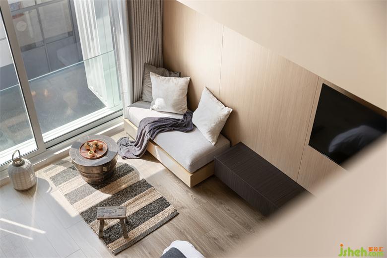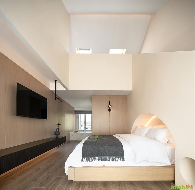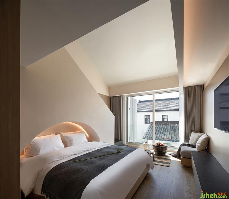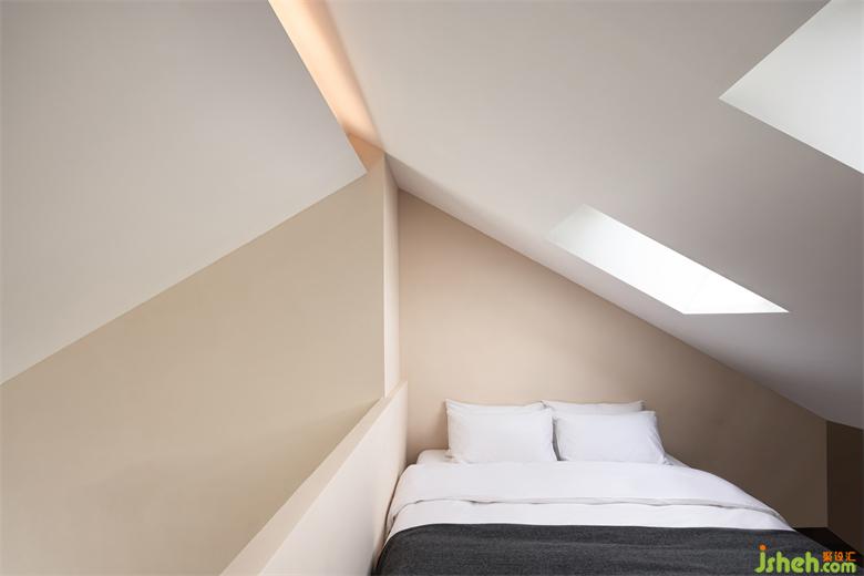 保留原本屋顶的坡面结构,loft房间将空间每一处都利用到极致,灯光与空调藏入结构中,最大化地让空间变得极简纯粹。