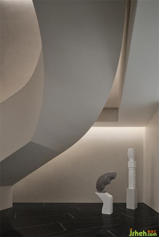 进入售楼处,呈现在视觉中心的是白色异形沙盘底座,仿佛两艘游轮在海面上行驶。圆顶造型与大理石,如大海与天空相呼应。