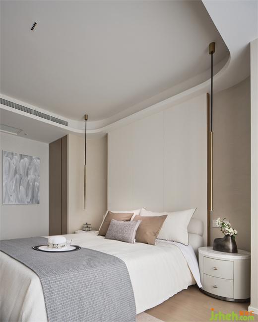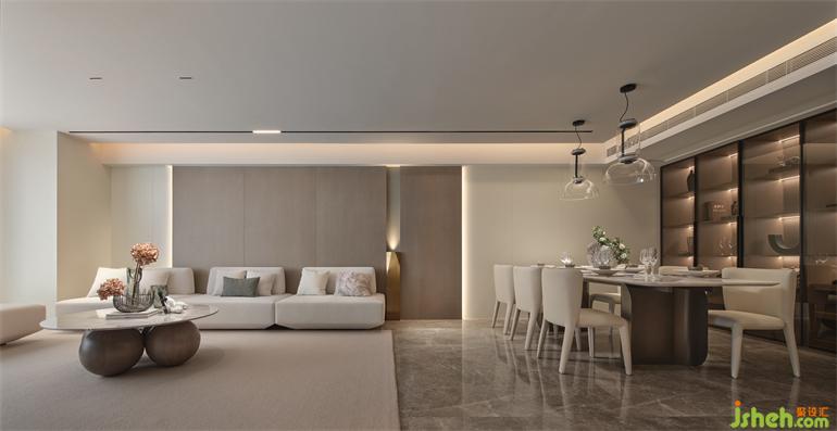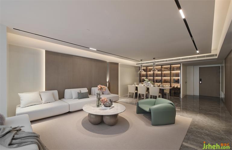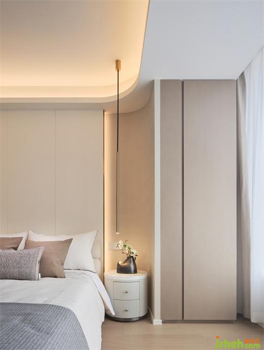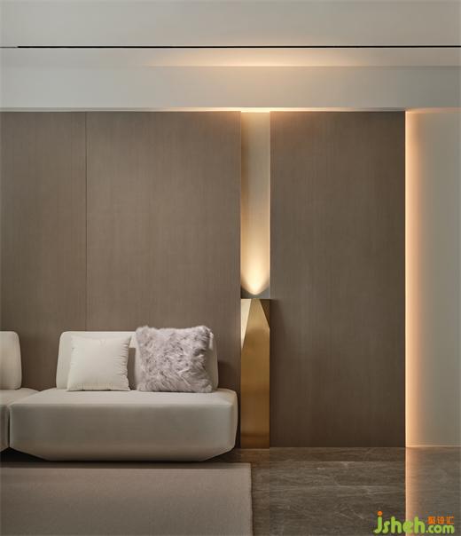 I户型温柔雅致,以素色为基调,嵌入背景墙内的异形雕塑,整个空间奠定了艺术感的生活基调。