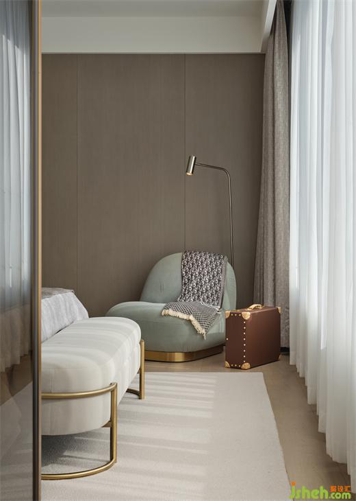 In the master bedroom, an open cloakroom is designed with an open space as much as possible for free movement. Meanwhile, the linear metal material make the space full of the sense of elegance and luxury.
