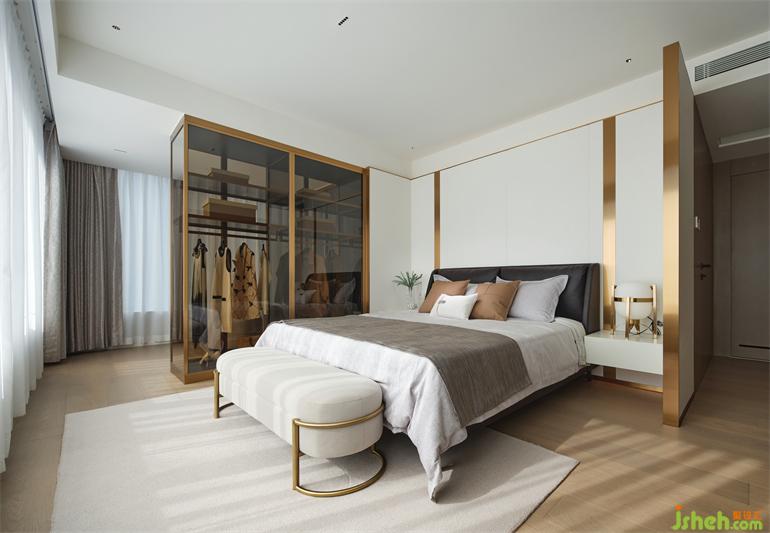 豪宅设计主卧室内设计了开放式衣帽间,空间尽量敞开,活动自由。金属的线性材料让空间充满典雅与奢华感。