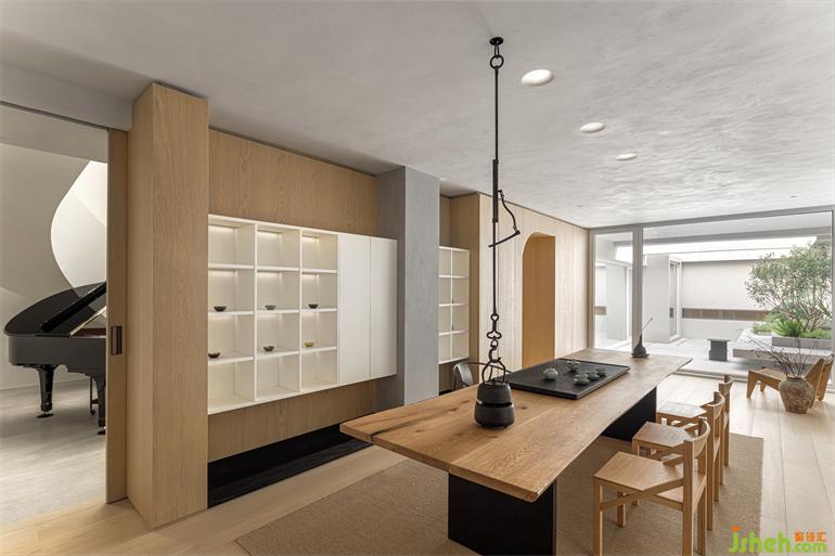 茶的禅意与哲学反映出主人的喜好与生活方式,台州别墅设计师在茶室中保持着极简与功能性,以木色体现空间氛围,让品茶融入生活,更是与自然产生对话。