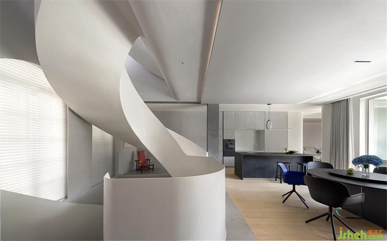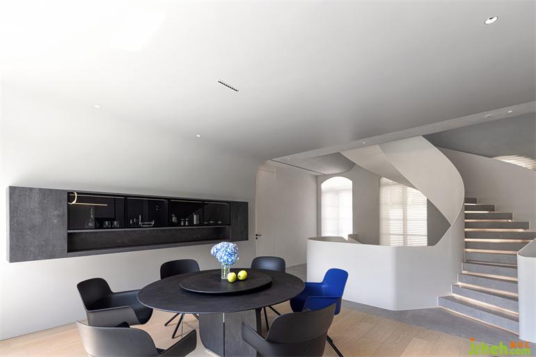 台州别墅设计空间中黑白搭配的比例关系让质感再次提升,墙体柜可以摆放足够多的书籍与艺术品,设计通过平衡中发挥其最大的美感。The proportional relationship between black and white in the space enhances the texture again. The wall cabinet can place enough books and artworks, and the design maximizes its beauty through balance.