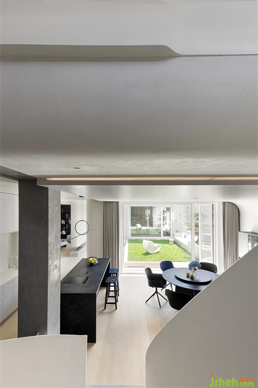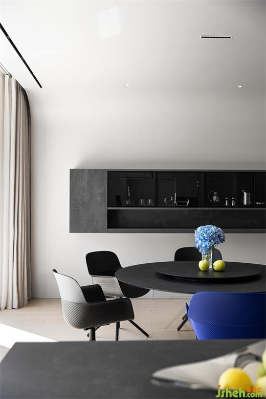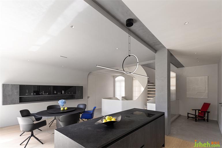 开放式厨房和餐厅以黑色,低调奢华的空间调性。台州别墅设计师运用简约、当代的手法去布局,借以保持空间的质感,外表平静,却承载了生活里的丰富。