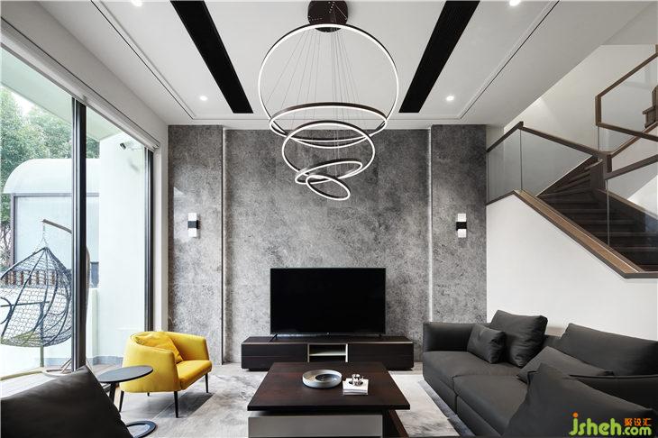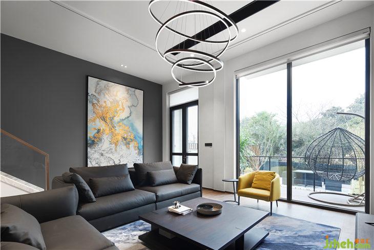 鹅黄色单椅及户外吊椅的设置,使得空间产生了很有趣的变化,室内与室外,布艺的实与铁艺的虚,金属的刚与布艺的柔,通过大面落地玻璃的设置,得到了完美对比和体现。