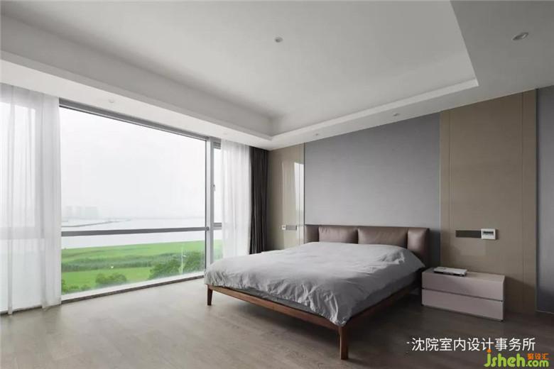 整面落地窗的设计使整体更加具有空间感,蓝色背景墙与蓝色沙发椅搭配空间,与窗外的湖景相互辉映。