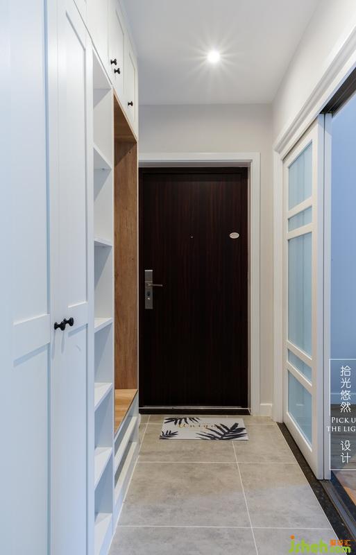 有奔波之后回家可以坐着换鞋的卡座,到家就希望你解放辛苦的双手,设计了镂空隔板可以放包包和钥匙,对面是玻璃推拉门,过道有光就不自觉卸下了一身的疲倦