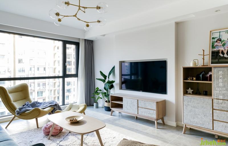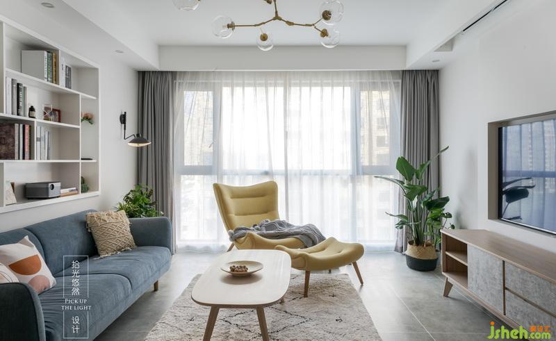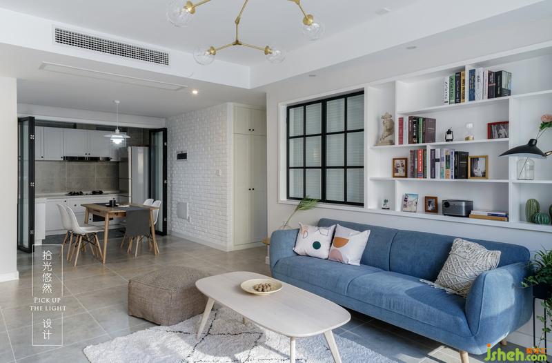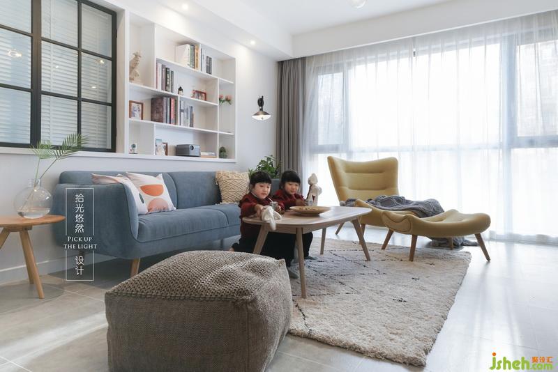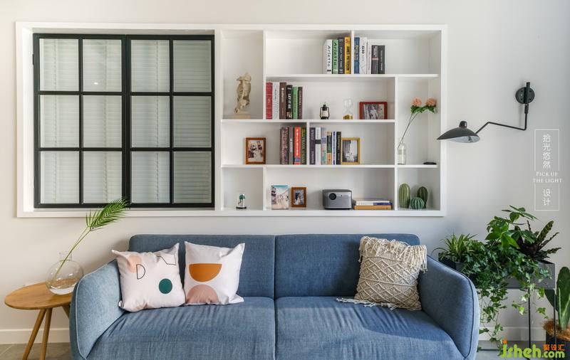 沙发背景墙的一边是铝合金边框喷黑色氟碳漆窗扇,它还构成了一个有意思的生活伏笔,另一边是现场做的装饰架,可以放下有关家人的珍贵瞬间