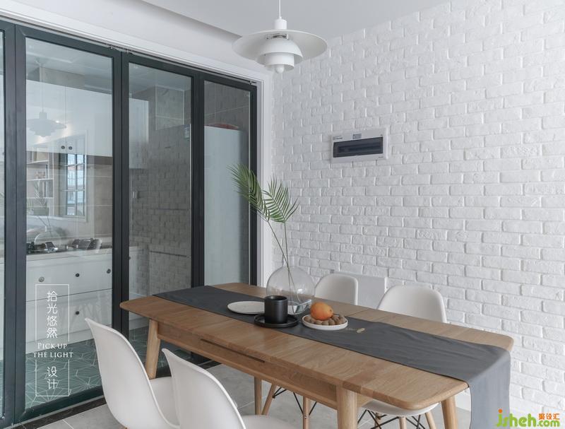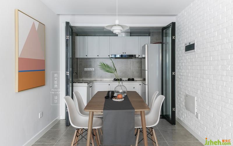 封了原本生活阳台与厨房之间的门,才让厨房用起来更顺手,透明玻璃做的折叠门能完全打开,在餐厅搭配了明亮的装饰画,认认真真陪在家人身边吃每一顿饭