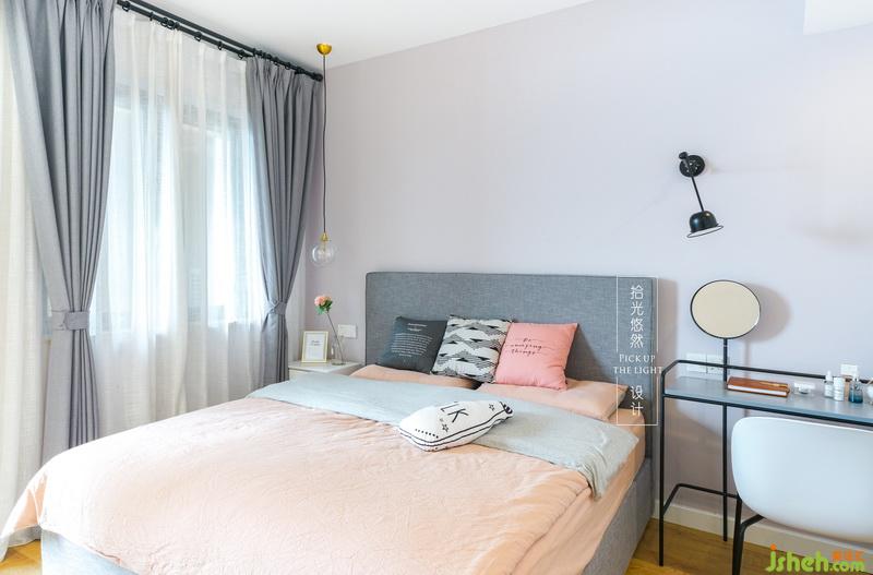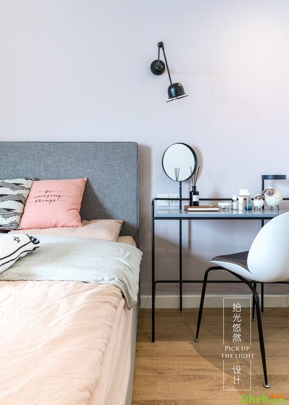 背景墙用了灰紫色,整理起来很轻松,不宣扬的色调很适合每一个温柔的梦, 梳妆台呈现出一种简洁硬朗感,瓶瓶罐罐们也不经意的有序排列了