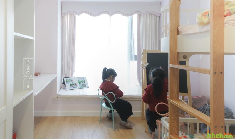 左边为双胞胎小可爱们做了可以写作业的书桌,以及放心爱玩具的陈列柜,飘窗和小黑板容纳她们的想象力