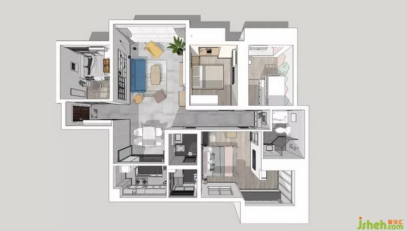 把原有的墙面拆除以后往外扩,独立的淋浴区、浴缸和双面盆,超级全面的功能体验感