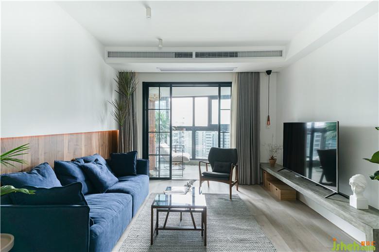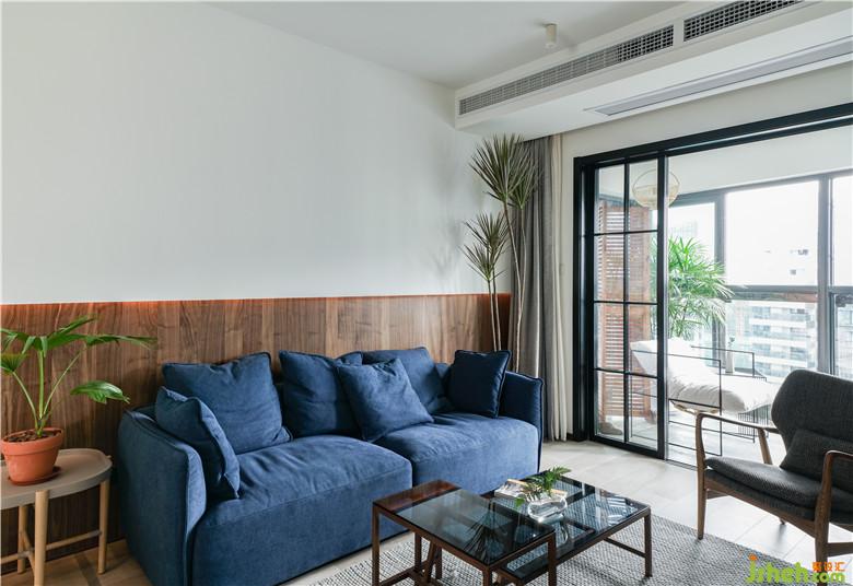 装修公司在客厅采用的是天然黑胡桃木饰面板作为护墙板,电视柜为现场浇筑的水泥台,氛围灯带,满足观影微光照明,客厅无主灯的设计,减少打理卫生的难度与次数