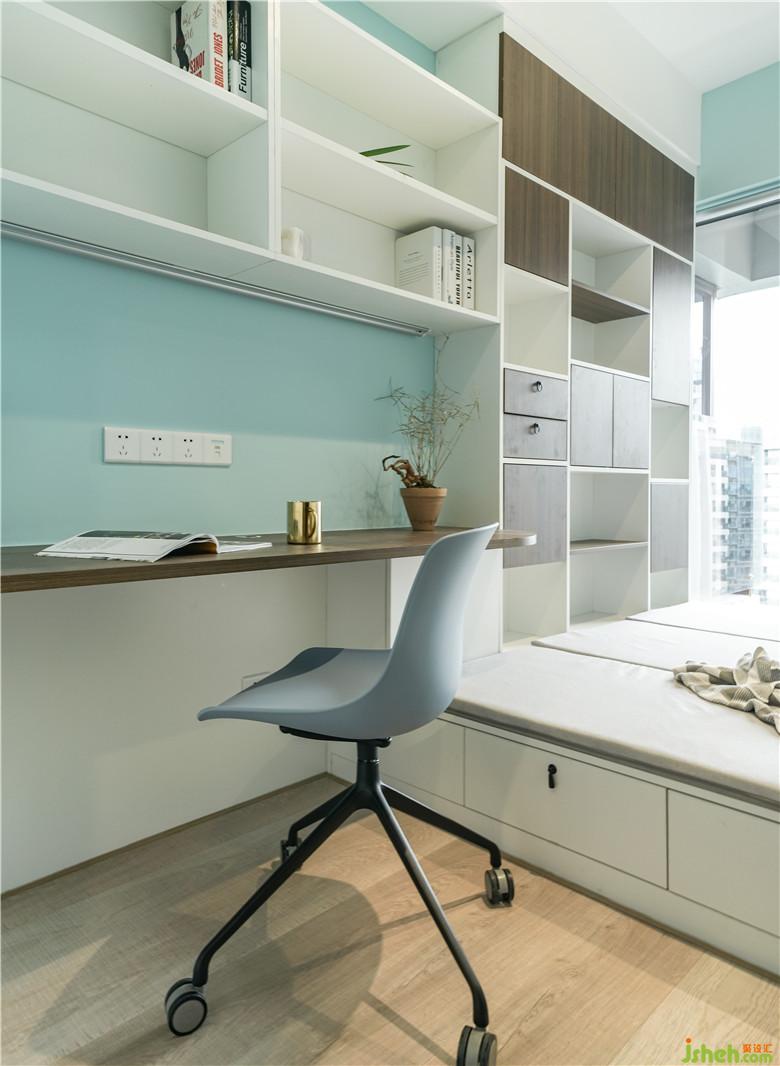 黑胡桃作为点缀,以白色与淡蓝绿色为基调,兼具了榻榻米收纳功能可以满足临时性的睡眠需求