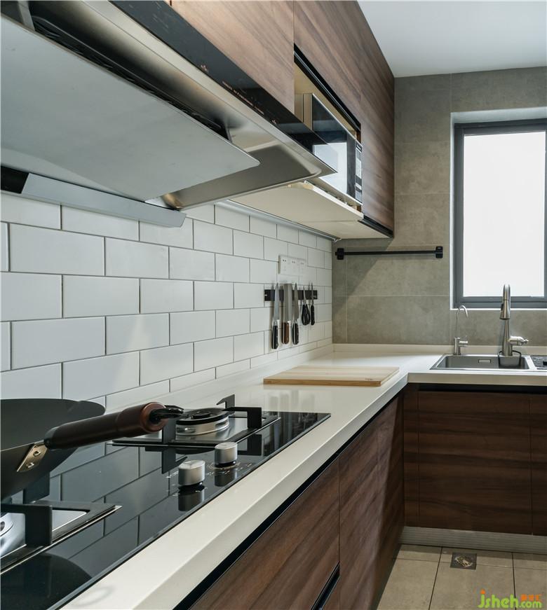 黑胡桃木色的橱柜搭配灰色水泥砖