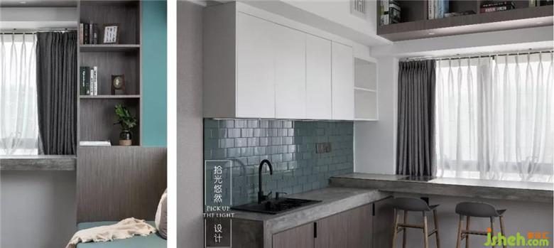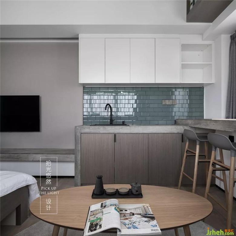 橱柜里有嵌入式冰箱,饿了的时候可以用电磁炉做轻烹饪,煮面条下饺子或者蔬菜沙拉,可以坐在吧台上就餐,走神,天马行空。