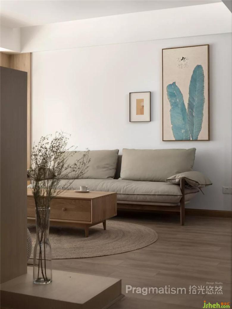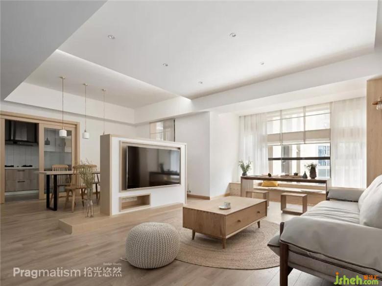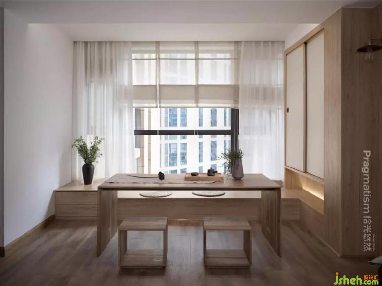 电视墻让客餐厅区域划分更明确,客厅采用无主灯设计,便于清洁与照明,茶台采用隼结构拼接不使用一钉一铆,还原本心回归自然