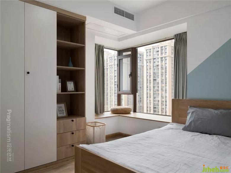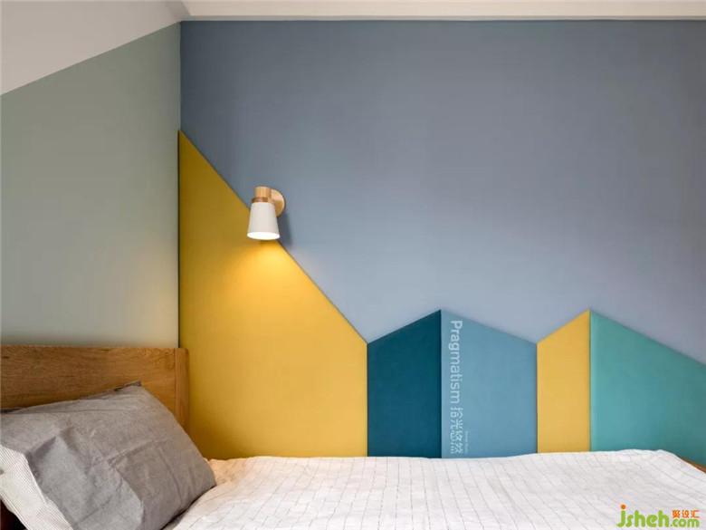 儿童房设计在整体北欧日式简约风上,着重选择了色彩饱满的硬包拼接工艺,防止儿童睡觉时发生磕碰同时增加童趣感